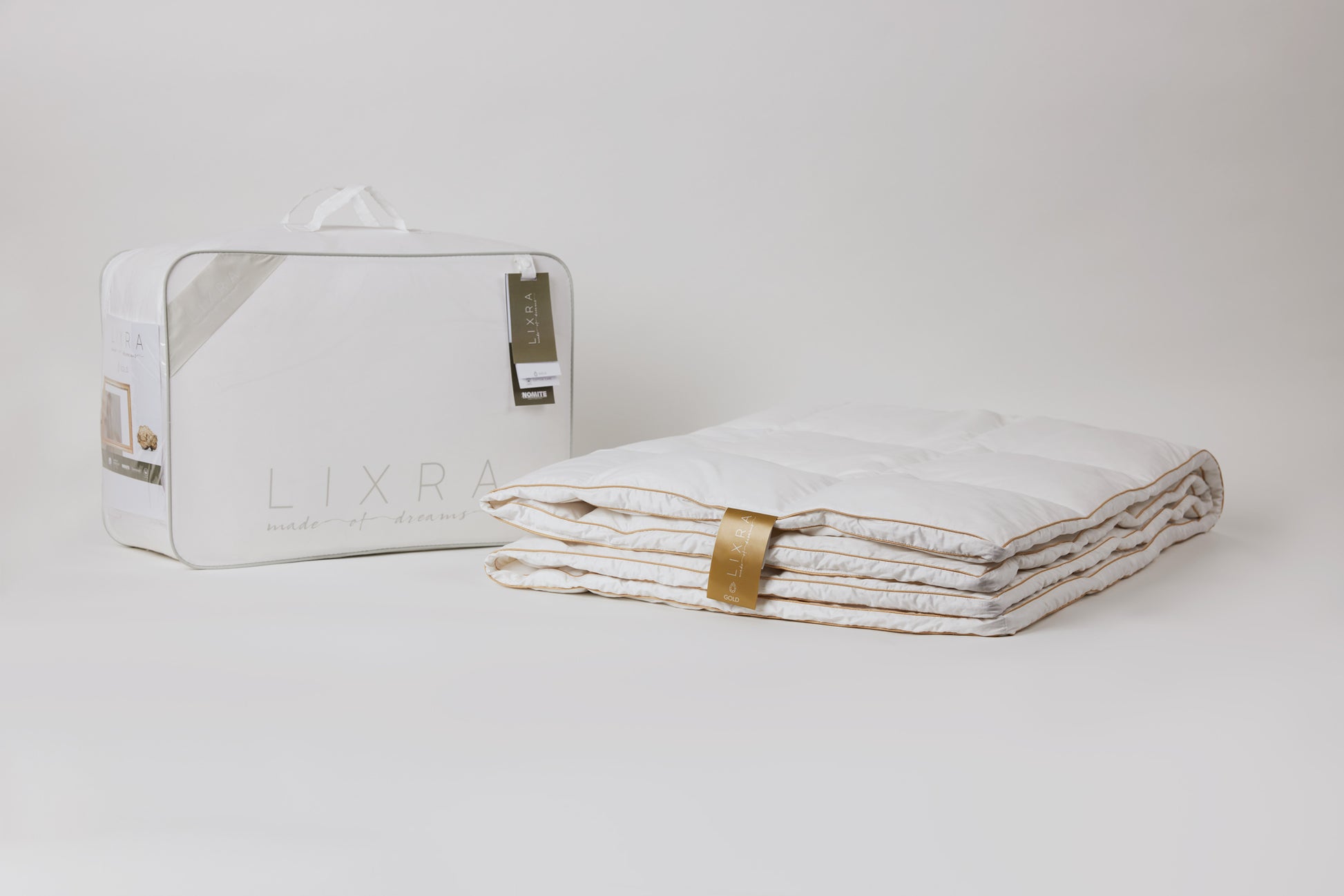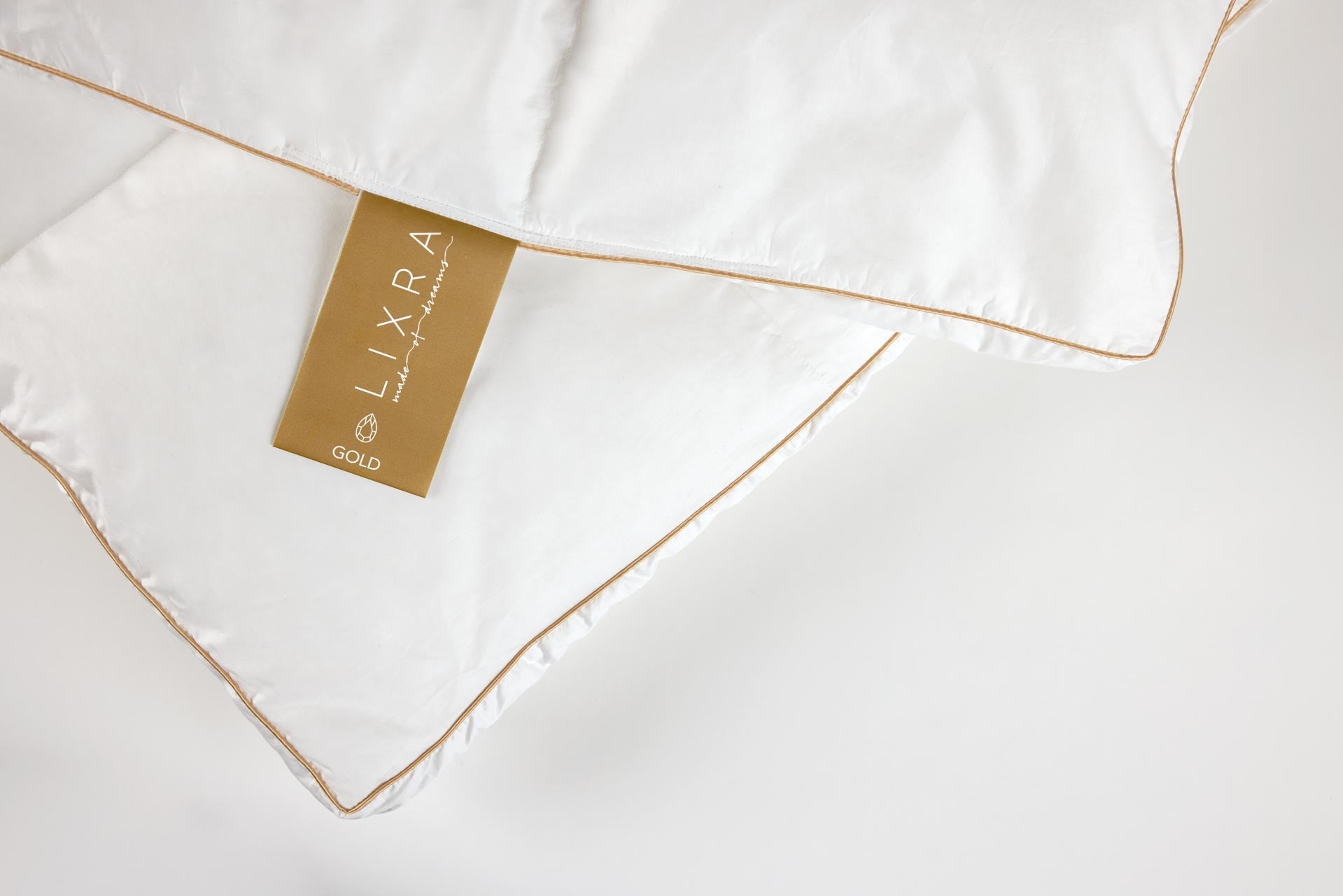 LIXRA Gold moskusdynen kan nydes hele året og fås i en let, lun og varm udgave som enkeltdyne og dobbeltdyne i to længder. Find flere detaljer i foldud-menuen under "materialer".
